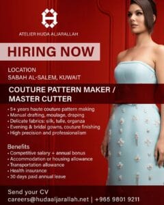 Huda AlJarallah Atelier is seeking a talented and experienced Fashion Pattern Maker / Head Cutter to join our couture team. The ideal candidate will translate complex fashion designs into precise patterns for evening and bridal gowns, working closely with our design team to bring creative visions to life.