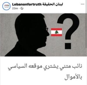 وكان الأشخاص محل الشكوى نشروا وروّجوا من جملة ما روجوه خبرين كاذبين على صفحاتهم، الأول حمل عنوان “بعد أن صنعه التيار في المتن الشمالي، كنعان يكمل طعنه في الخاصرة ويتوجه للتحالف المحتمل مع جعجع”، والخبر الثاني من ضمن سلسلة الأخبار الخبيثة والدنيئة بعنوان “نائب متني يشتري موقعه السياسي بالأموال”.