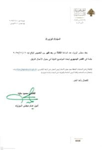 يعقد مجلس الوزراء جلسة عند الساعة الثالثة من بعد ظهر يوم الخميس الواقع فيه 2025/11/6 في القصر الجمهوري مرفق مع جدول أعماله.