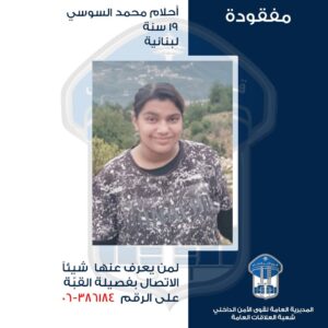 “تُعمِّم المديريّة العامّة لقوى الأمن الدّاخلي بناءً على إشارة القضاء المختص، صورة المفقودة
