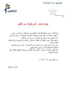 ومن جهتها أصدرت بلدية سن الفيل بيانًا توضيحيًا ردّت فيه على ما يتم تداوله بشأن كتاب موجّه إلى رئيس وأعضاء المجلس البلدي، يتناول معلومات عن تحرّكات منسوبة لأشخاص من “حزب الله” داخل أحد المباني في البلدة، مما أثار اعتراض عدد من السكان.