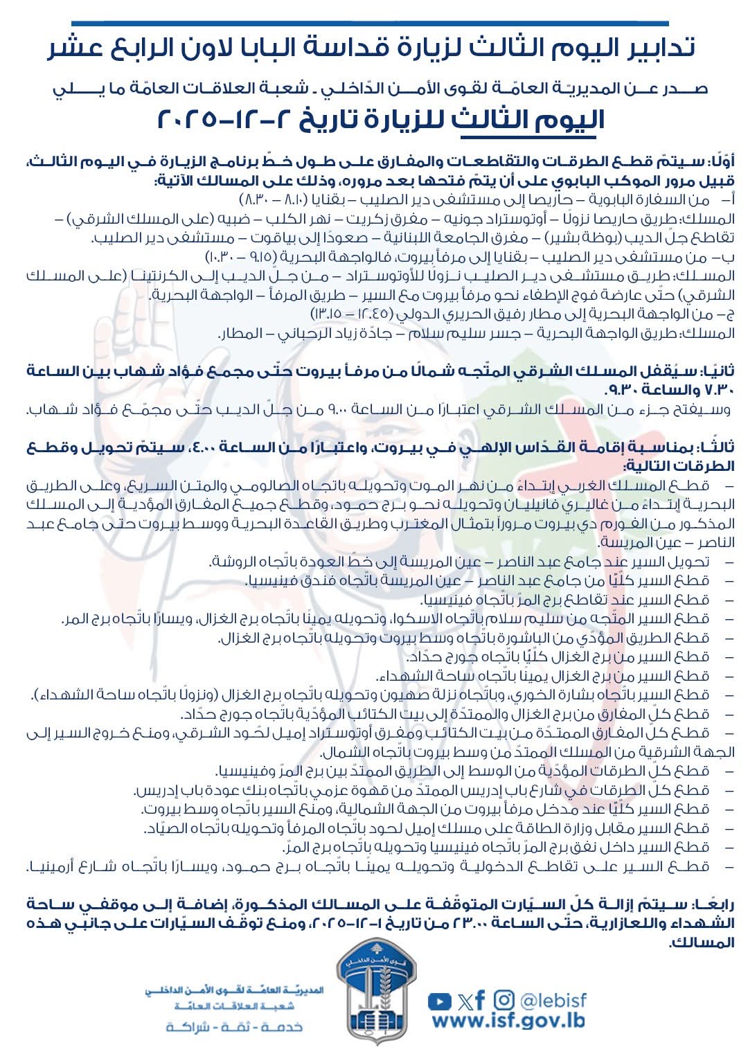 “بتدابير سير اليوم الثالث لزيارة قداسة البابا لاون الرابع عشر لبنان بتاريخ 2-12-2025