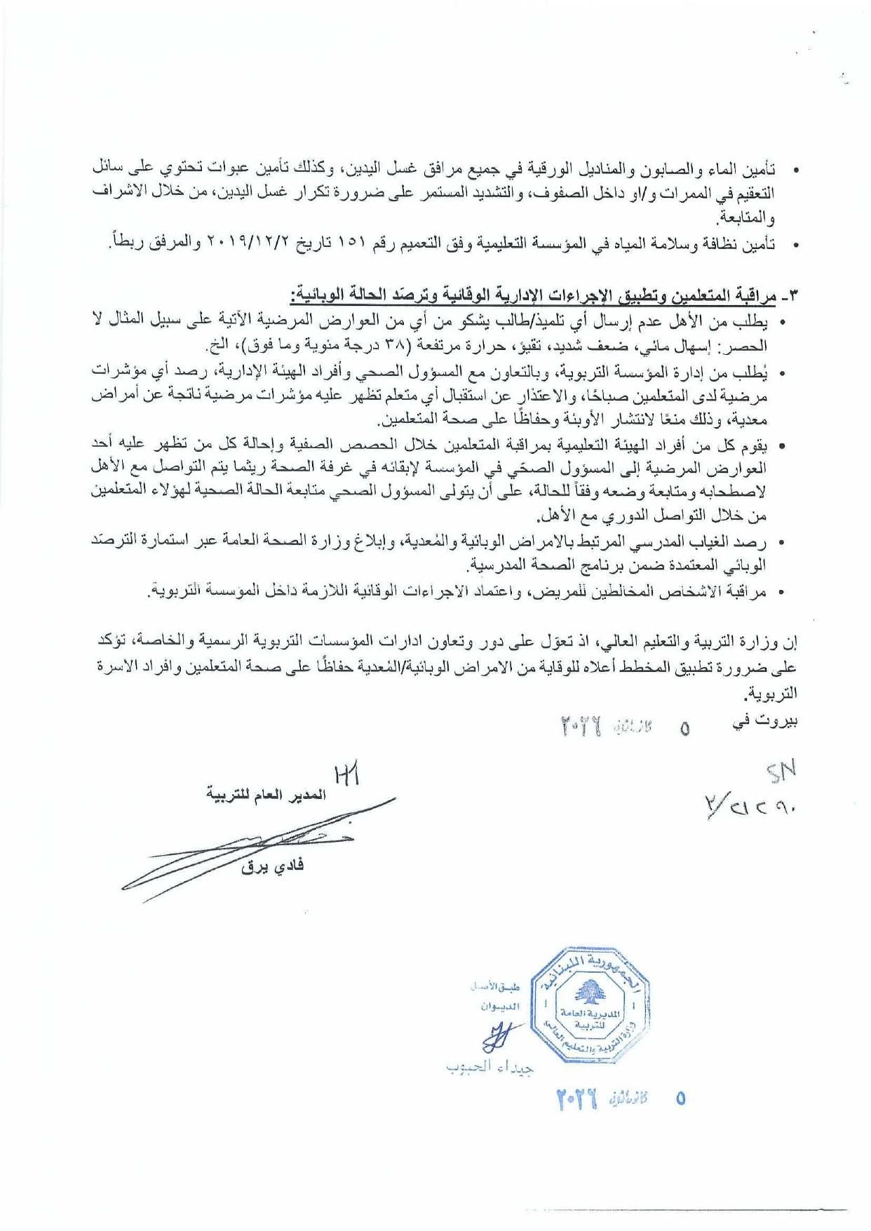 أصدرت وزارة التربية والتعليم العالي – المديرية العامة للتربية، تعميمًا رقم واحد موجّهًا إلى جميع المسؤولين عن المؤسسات التربوية الخاصة والرسمية في لبنان، حول الإجراءات الوقائية الواجب اعتمادها للحد من انتشار الأمراض الوبائية والمعدية داخل المؤسسات التعليمية.
