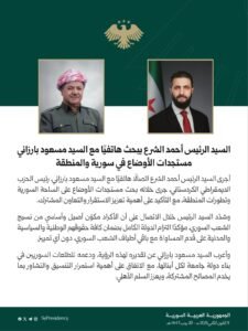 “أجرى السيد الرئيس أحمد الشرع اتصالا هاتفيًا مع السيد مسعود بارزاني، رئيس الحزب الديمقراطي الكردستاني، جرى خلاله بحث مستجدات الأوضاع على الساحة السورية وتطورات المنطقة، مع التأكيد على أهمية تعزيز الاستقرار والتعاون المشترك.