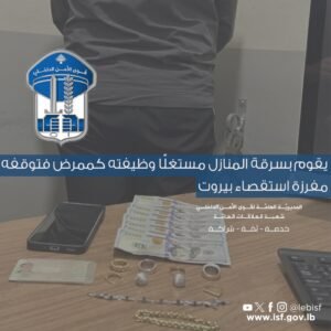 في إطار المتابعة المستمرّة التي تقوم بها قوى الأمن الداخلي لمكافحة الجرائم في مختلف المناطق اللبنانيّة، وبناءً على معلومات توافرت لدى مفرزة استقصاء بيروت في وحدة شرطة بيروت حول قيام ممرّض يعمل في مجال التمريض المنزلي باستغلال وجوده داخل منازل المرضى وسرقة مقتنيات منها، وبعد ورود شكوى حول فقدان مسروقات وأغراض من منزل إحدى العائلات في محلّة السيوفي، باشرت المفرزة إجراءاتها الاستقصائية والميدانية لكشف الفاعل وتوقيفه.