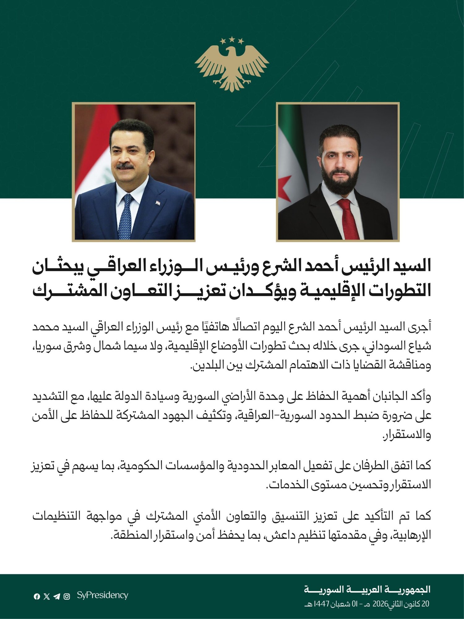 “أجرى السيد الرئيس أحمد الشرع اليوم اتصالا هاتفيًا مع رئيس الوزراء العراقي السيد محمد شياع السوداني، جرى خلاله بحث تطورات الأوضاع الإقليمية، ولا سيما شمال وشرق سوريا، ومناقشة القضايا ذات الاهتمام المشترك بين البلدين.