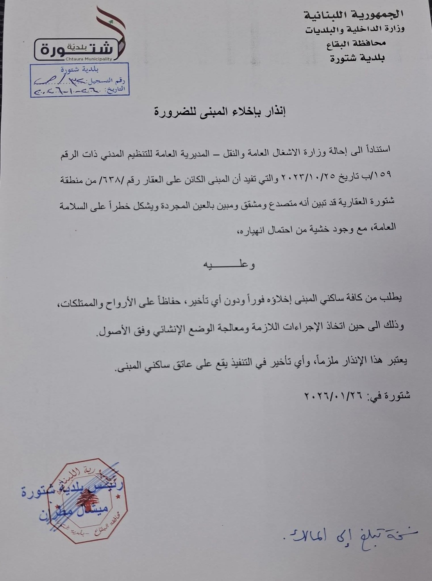 صدر إنذار رسمي بإخلاء مبنى سكني كائن على العقار رقم /638/ في منطقة شتورة العقارية، وذلك للضرورة القصوى وخشية تعرّضه للانهيار.