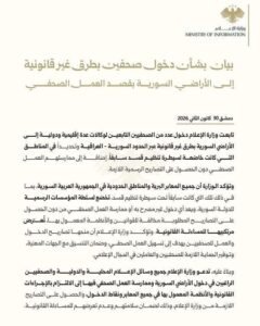 وشددت الوزارة على “ضرورة التزام الصحافيين والمؤسسات الإعلامية بالأطر القانونية المعتمدة للحصول على التراخيص والموافقات اللازمة قبل الدخول إلى الأراضي السورية أو ممارسة أي نشاط إعلامي، حفاظاً على سلامتهم الشخصية وضماناً لانتظام العمل الصحفي وفق القوانين النافذة”.