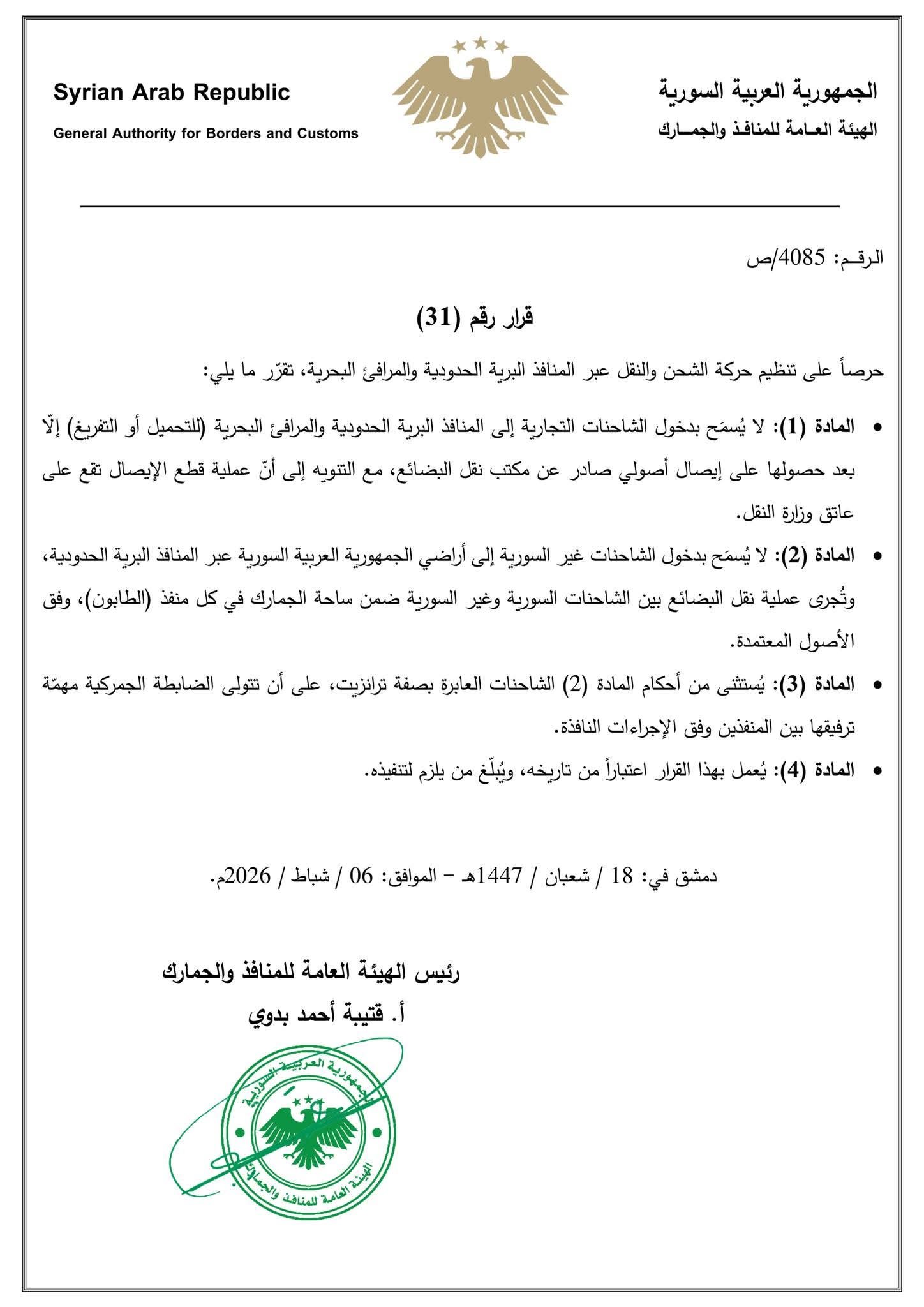 فيما يلي صورة القرار الصادر عن الهيئة العامة للمنافذ والجمارك السورية.