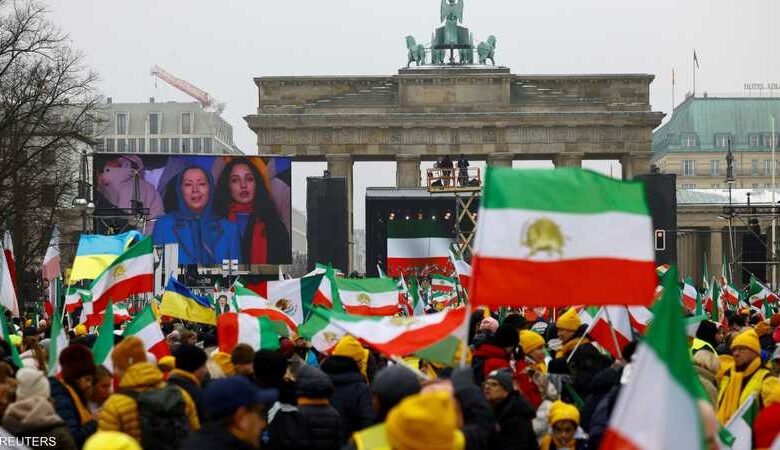 وأوضحت الشرطة الألمانية أن نحو 10 آلاف متظاهر تجمعوا أمام بوابة براندنبورغ وسط برلين، بدعوة من «المجلس الوطني للمقاومة الإيرانية» المرتبط بمنظمة «مجاهدي خلق» المعارضة، والتي تصنّفها السلطات الإيرانية منظمة «إرهابية».