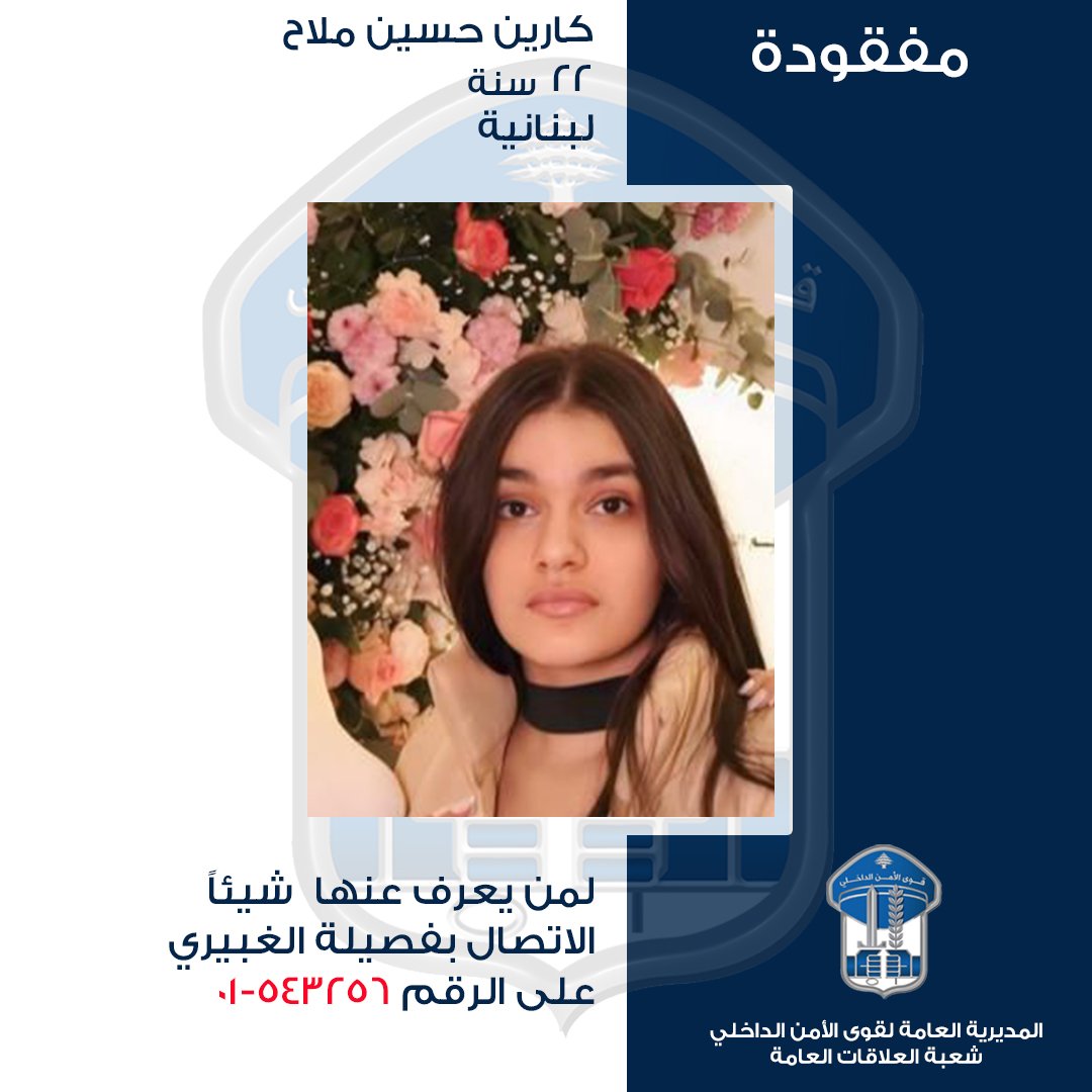 “تُعمِّم المديريّة العامّة لقوى الأمن الدّاخلي، بناءً على إشارة القضاء المختص، صورة المفقودة: