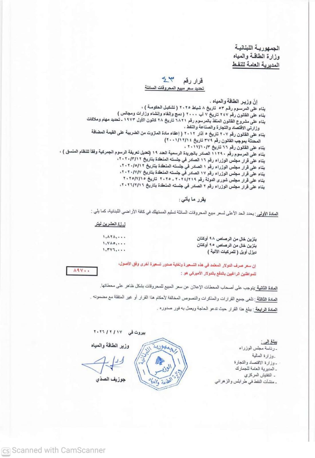 صدر عن وزارة الطاقة والمياه جدول جديد لأسعار المحروقات، وجاءت على الشكل الآتي: