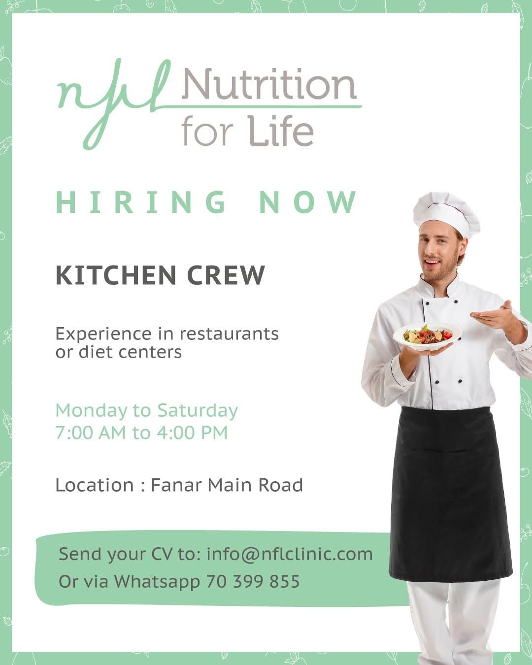 • تعلن Nutrition for Life – NFL clinic عن حاجتها إلى طاقم مطبخ ذو خبرة في المطاعم أو مراكز التغذية.