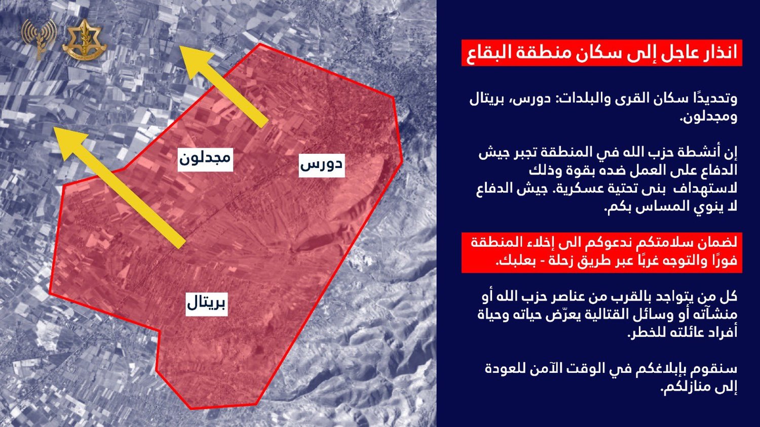 “انذار عاجل إلى سكان منطقة البقاع وتحديدًا سكان القرى والبلدات: دورس، بريتال ومجدلون