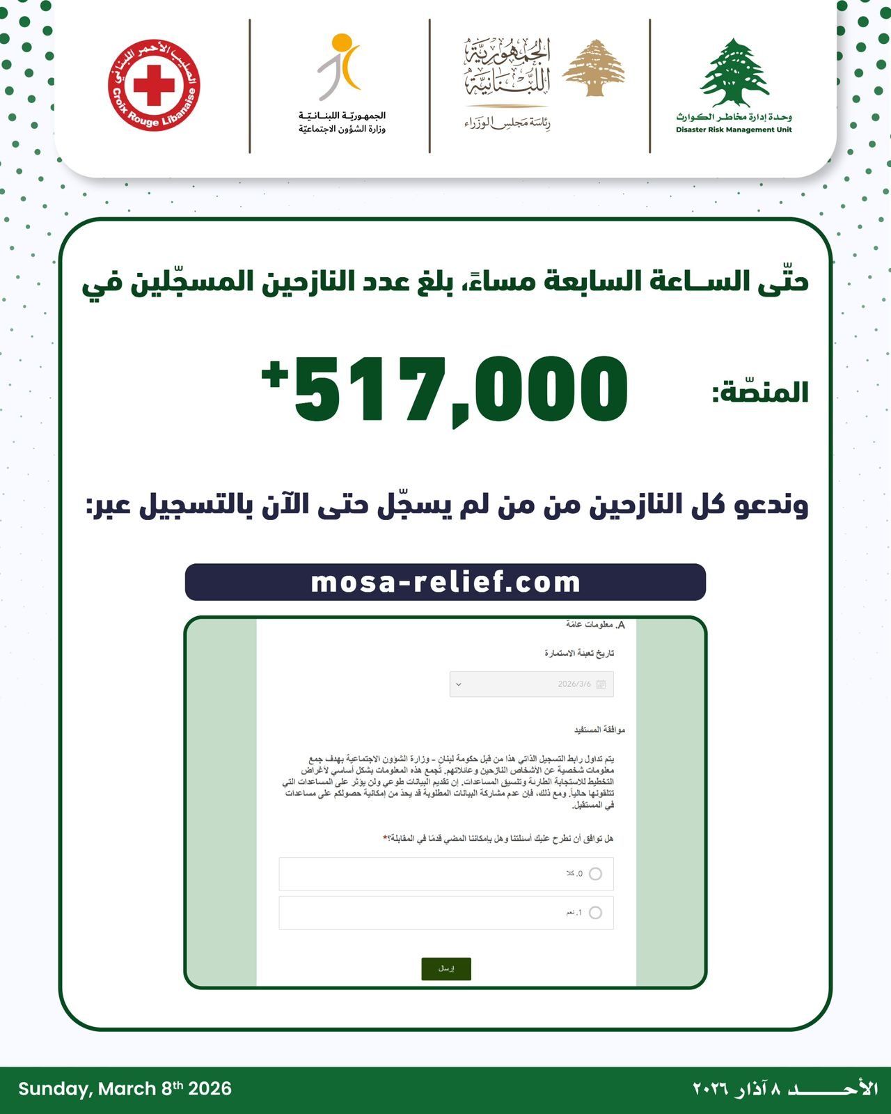 كما وندعو كل من النازحين، ضمن مراكز الإيواء وخارجها، بالتسجيل فورًا عبر الموقع الالكتروني: mosa-relief.com