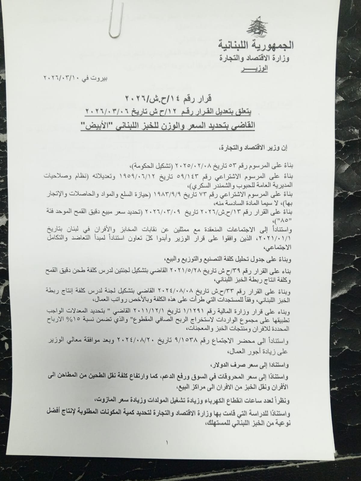 وبناء على القرار رقم ۳۳ ح ش تاريخ ۲۰۲٤/۰۸/۰۸ القاضي بتشكيل لجنة لدرس كلفة إنتاج ربطة الخبز اللبناني، وفقاً للمستجدات التي طرأت على هذه الكلفة وبالأخص رواتب العمال