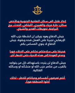 غرد المتحدث باسم الجيش الاسرائيلي بلسان عربي أفيخاي أدرعي عبر حسابه على منصة إكس محذرًا “سكان الضاحية الجنوبية وبالأخص سكان أحياء:
