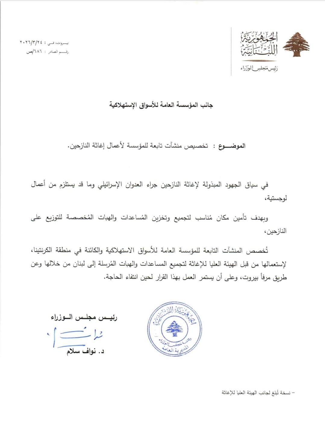 “كتاب موجه من رئيس مجلس الوزراء إلى جانب المؤسسة العامة للأسواق الاستهلاكية لتخصيص منشآت تابعة للمؤسسة لأعمال إغاثة النازحين.”