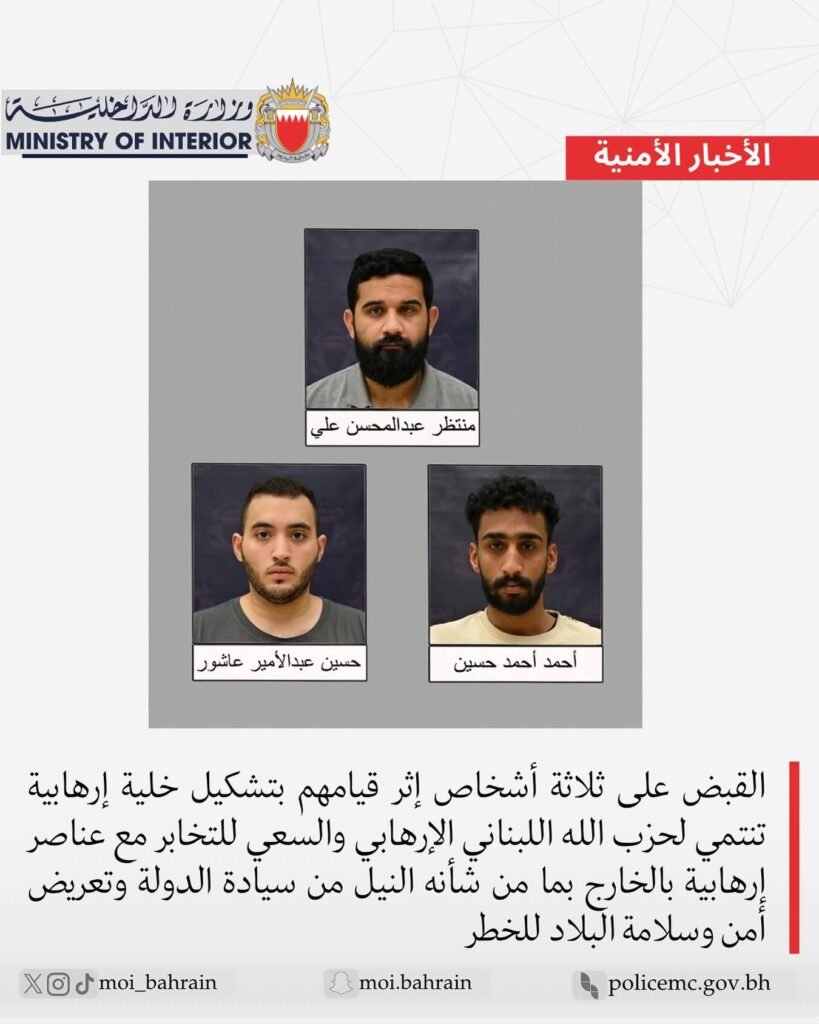 أعلنت وزارة الداخلية البحرينية في بيان، أن “الإدارة العامة للمباحث والأدلة الجنائية، تمكنت من القبض على ثلاثة أشخاص، إثر قيامهم بتشكيل خلية إرهابية تنتمي لمنظمة حزب الله اللبناني الإرهابي، قاموا بالتنسيق مع عناصر إرهابية في الخارج، والسعي للتخابر معها بما من شأنه النيل من سيادة الدولة وبث الخوف والرعب لدى المواطنين والمقيمين وتعريض أمن وسلامة البلاد للخطر.