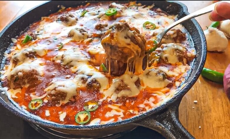 – اضغطي على خليط اللحم المفروم في طبق خبز مدهون بالزبدة. وزعي خليط الكاتشب وصلصة الشواء المتبقيين بالتساوي على اللحم.