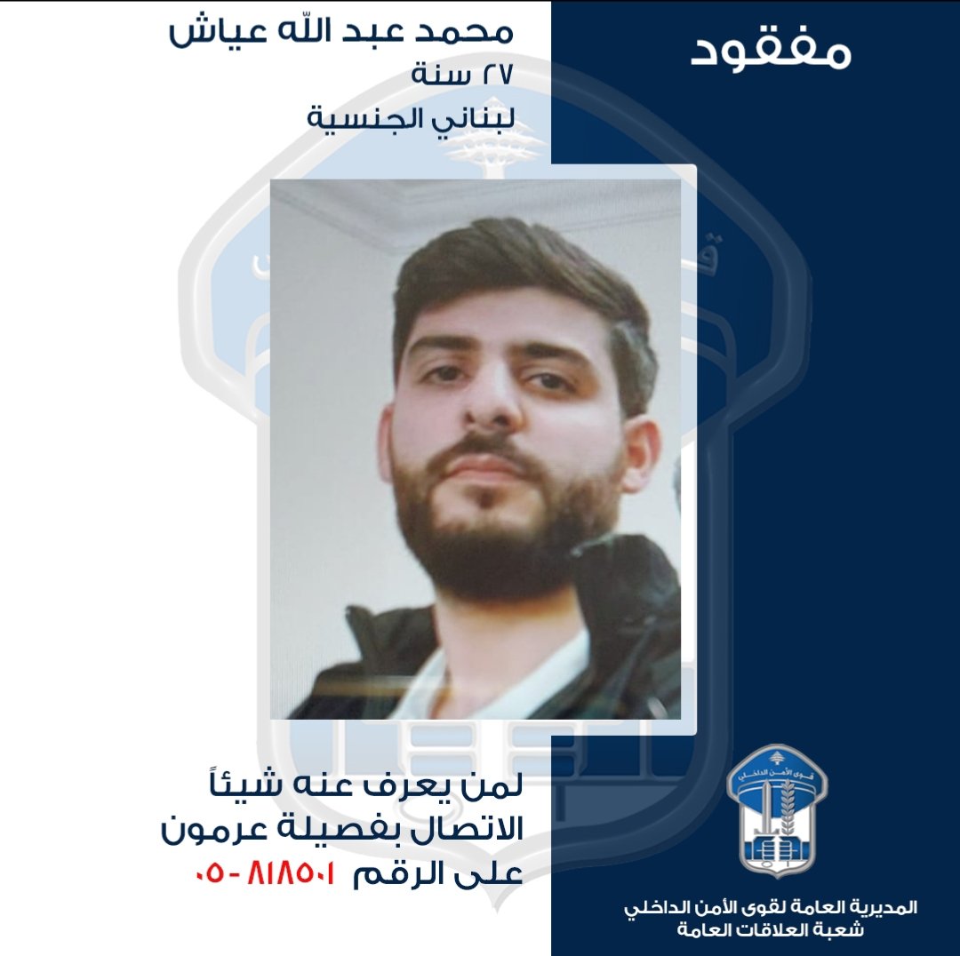 “تُعمِّم المديريّة العامّة لقوى الأمن الدّاخلي بناءً على إشارة القضاء المُختصّ، صورة المفقود:
