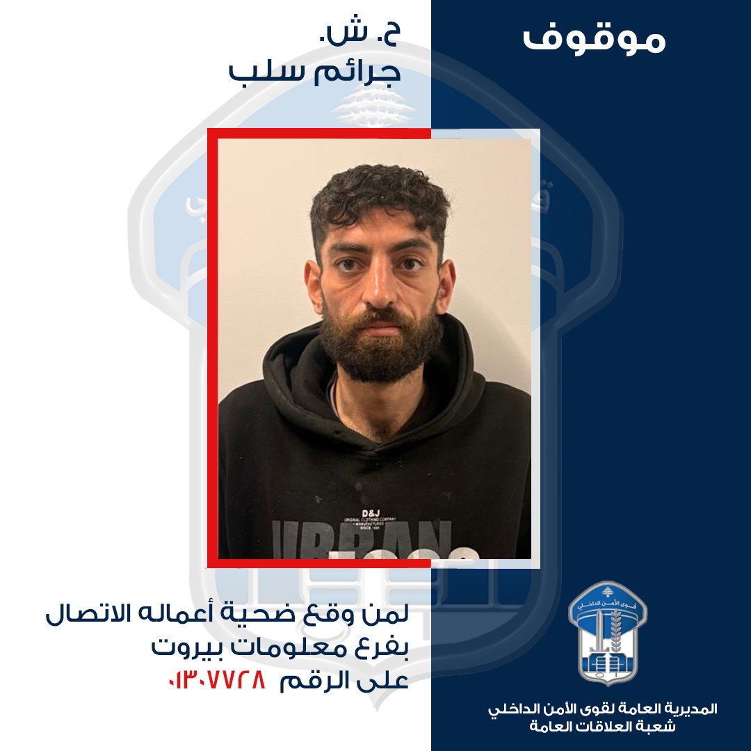 “بعد ورود عدّة شكاوى حول قيام شخص بعمليات سلب بقوّة السلاح، في عدّة مناطق في بيروت وجبل لبنان، بدأت شعبة المعلومات تحرّياتها واستقصاءاتها، وبنتيجة المتابعة تمّ التوصّل إلى توقيف المشتبه به في محلّة صبرا، ويدعى: