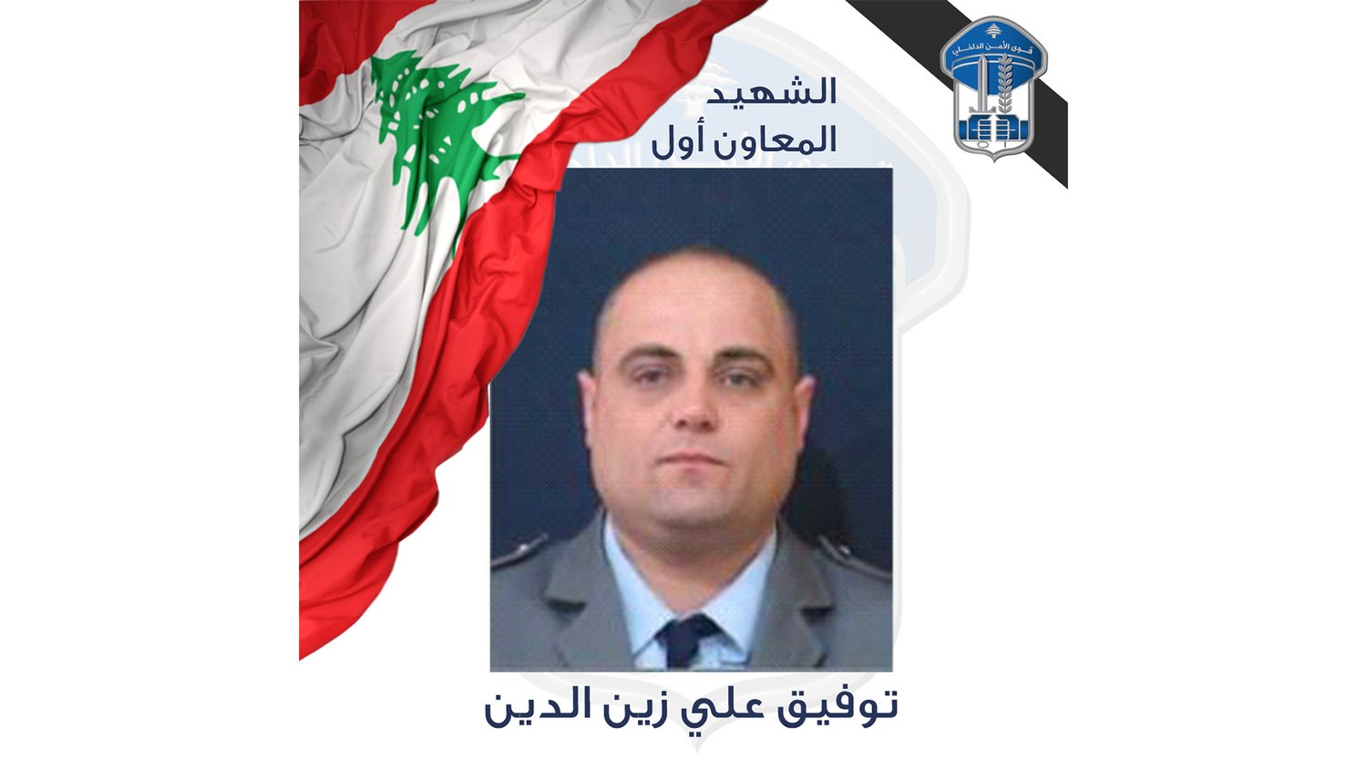 “تنعي المديريّة العامّة لقوى الأمن الداخلي شهيدها المعاون أوّل توفيق علي زين الدين الذي استشهد بتاريخ 8-4-2026، جرّاء عدوان إسرائيلي استهدف المبنى الذي يسكن فيه في محلة حي السّلّم-الضاحية الجنوبية، بالإضافة إلى سقوط عدد من الشهداء معه. وقد عُثِرَ على جثمانه تحت الأنقاض بتاريخ 11-04-2026