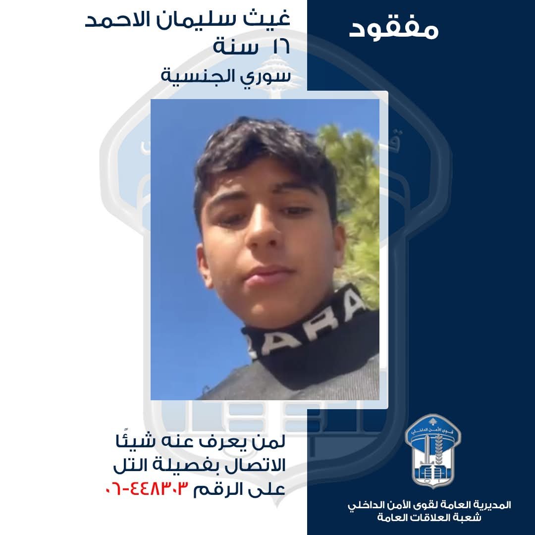 “تُعمِّم المديريّة العامّة لقوى الأمن الدّاخلي بناءً على إشارة القضاء المُختصّ، صورة المفقود القاصر:
