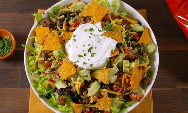 – غطِ السلطة برقائق دوريتوس المكسرة، وكميات صغيرة من الكريمة الحامضة، والصوص.