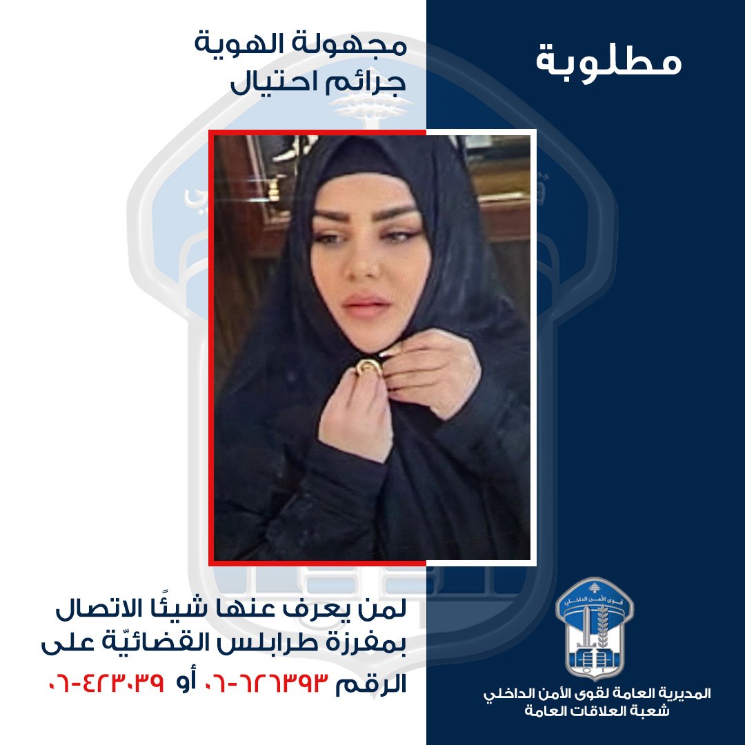 “بناءً على إشارة القضاء المختصّ، تُعمّم المديريّة العامّة لقوى الأمن الدّاخلي، صورة سيّدة مجهولة الهويّة، للاشتباه بتنفيذها عمليّات احتياليّة في مدينة طرابلس وضواحيها، بحيث قامت ببيع أونصة ذهبيّة مغشوشة بطريقة احترافية إلى أحد مالكي محال المجوهرات في طرابلس، بعد أن أوهمته بأنّها أصليّة.