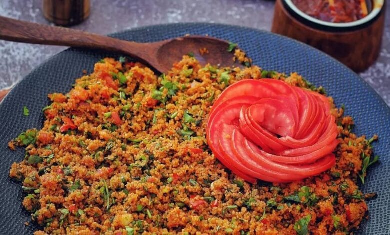 – نضيف مكونات الخضار فوق البرغل، و(ندعكها)براحة اليد.